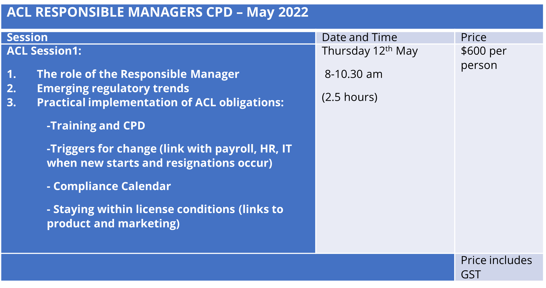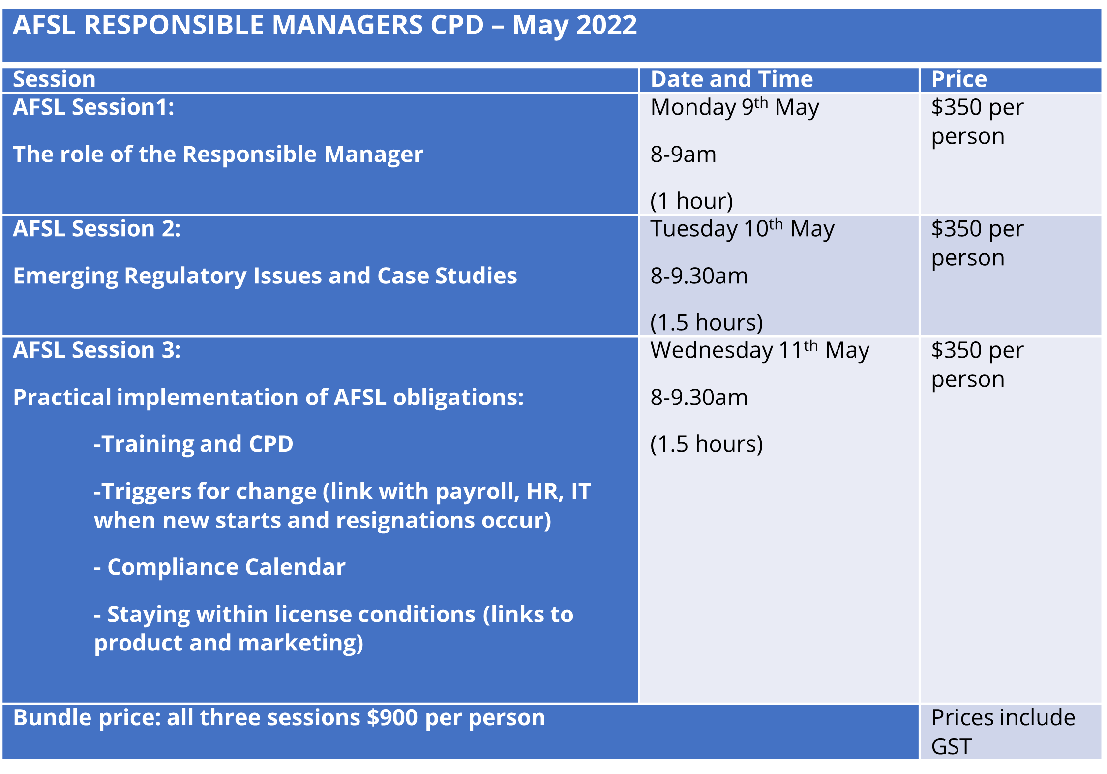 Liam O’Brien, GRC Solutions’ Subject Matter Expert, delivers a series of short Responsible Managers Continuing Professional Development virtual workshops for Australian Financial Services Licensees and Australian Credit Licensees.